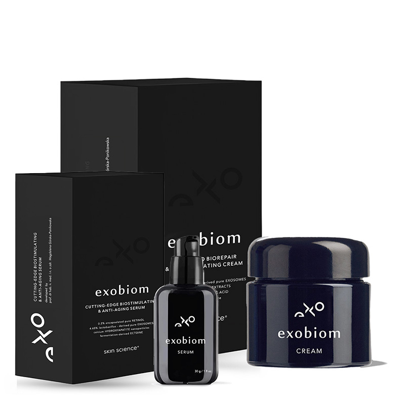 Exobiom Serum Biostymulujące przeciwstarzeniowe serum do twarzy i okolic oczu z egzosomamiEgzosomy, retinol, nanocząstki hydroksyapatytu wapnia, ektoina, oleje fermentowane.