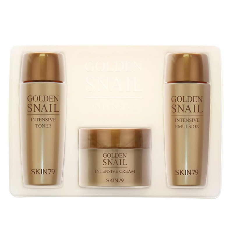 Składowa Skin79 Golden Snail Intensive Emulsion Emulsja do twarzy występuje w zestawie Golden Snail Intensive Miniature Set w zmienionej objętości.
