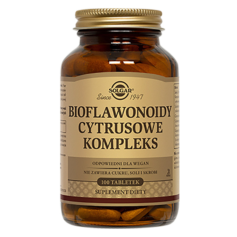 Bioflawonoidy Cytrusowe Kompleks 1000 mg. Suplement diety marki Solgar w swoim składzie zawiera wyłącznie standaryzowane bioflawonoidy pozyskiwane z takich cytrusów jak cytryny, pomarańcze, limetki, grejpfruty i mandarynki. Bioflawonoidy są związkami nadającymi barwę roślinom, przeze wszystkim owocom, stąd tak piękne kolory cytrusów. Bioflawonoidy posiadają właściwości antyoksydacyjne, neutralizują więc szkodliwe działanie wolnych rodników, tym samym opóźniając proces starzenia się skóry, pojawiania się zmarszczek i utraty jędrności.