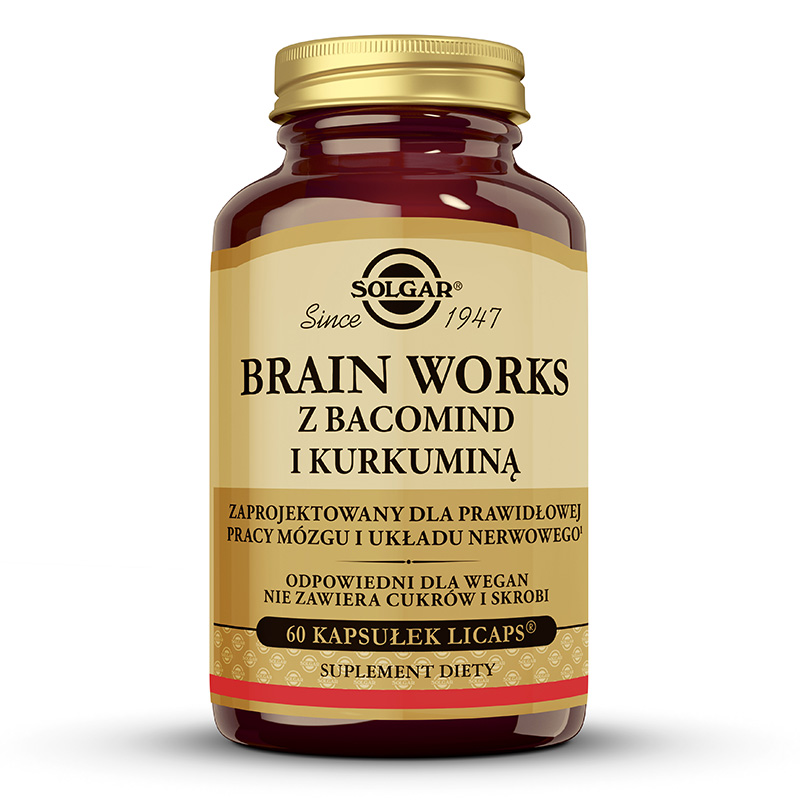 Preparat Brain Works zawiera standaryzowany ekstrakt z ziela bakopy, kłącza kurkumy w formie płynnych miceli, cholinę oraz witaminę B12. Witamina B12 przyczynia się do prawidłowego funkcjonowania układu nerwowego oraz zmniejszenia uczucia zmęczenia i znużenia.
