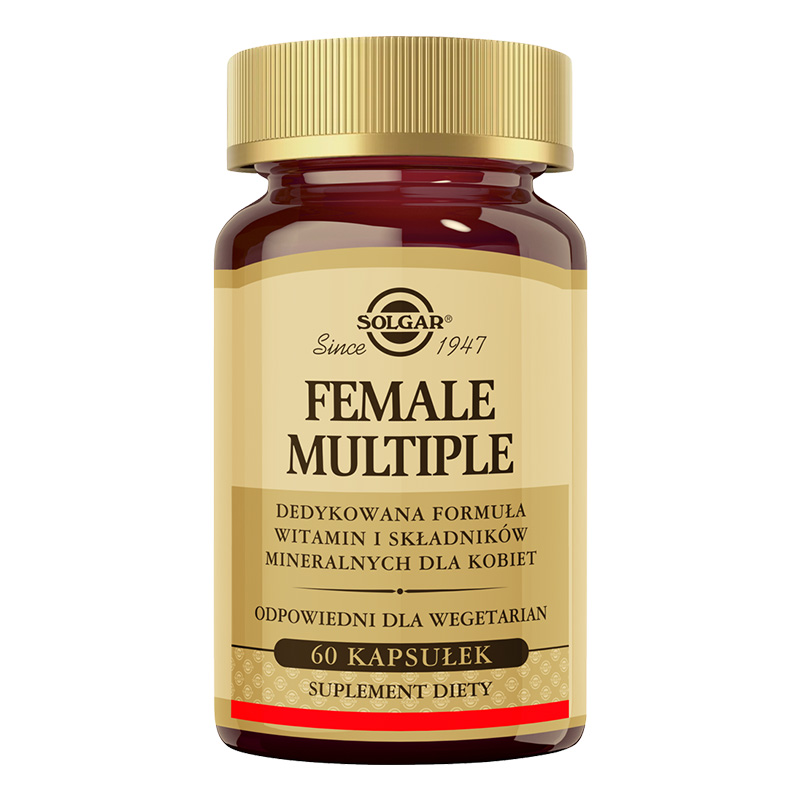 Produkt oparty jest na dobrze przyswajalnych formach składników mineralnych, w tym chelatach aminokwasowych, które są łagodne dla przewodu pokarmowego. Solgar Female Multiple może stanowić element codziennej suplementacji kobiet, które chcą w sposób kompleksowy uzupełniać dietę w niezbędne mikro- i makroelementy.