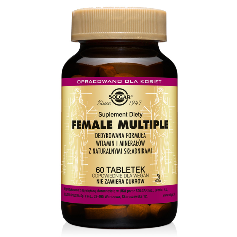 Solgar Female Multiple to suplement diety przeznaczony dla osób dorosłych, rekomendowany szczególnie kobietom jako uzupełnienie codziennej diety w witaminy i składniki mineralne.