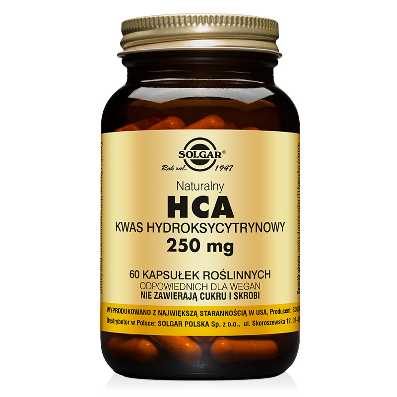 HCA Naturalny Kwas Hydroksycytrynowy pozyskiwany z rośliny Garcina Cambogia w procesie ekstrakcji. W suplemencie marki Solgar wykorzystana została najbardziej aktywna biologicznie forma, czyli kwas L-hydroksycytrynowy w optymalnej ilości 250 mg. Modyfikując metabolizm tłuszczów w bezpieczny sposób naśladuje naturalnie występujący w organizmie kwas cytrynowy. Dlatego ułatwia kontrolę apetytu, zwiększa tempo termogenezy. Rezultatem jest wspomaganie procesu odchudzania.
