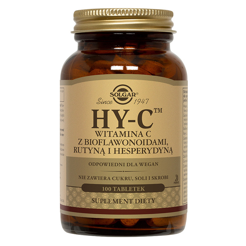 Hy-C - 600 mg witaminy C z bioflawonoidami, rutyną i hesperydyną wykazuje pozytywny wpływ na odporność organizmu. Naturalna witamina C działa antyoksydacyjnie, podobnie hesperydyna, która wzmacnia jej działanie. Dzięki temu możliwe jest utrzymanie odpowiedniej struktury kolagenu, poprawie ulega stan skóry. Rutyna wykazuje pozytywny wpływ w przypadku cery naczynkowej. Ponadto kompleks witaminy C z bioflawonoidami, rutyną i hesperydyną utrzymują przed długi czas odpowiednio wysoki poziom witaminy C w komórkach.