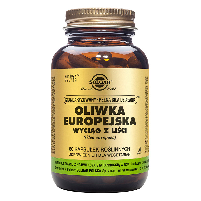 Oliwka Europejska - Wyciąg z liści Olea europea z nieprzetworzonych, sproszkowanych liści oliwki europejskiej oraz wyciąg z liści, który jest standaryzowany. Zapewnia to optymalne działanie suplementu diety marki Solgar. Oliwka Europejska, dzięki obecności beta-karotenu i witaminy C, wykazuje bardzo silne działanie antyoksydacyjne niwelując szkodliwe działanie wolnych rodników. Dzięki wykorzystaniu ekstraktów oraz sproszkowanego, nieprzetworzonego zioła wykazuje siłę działania jak roślina występująca w naturze.