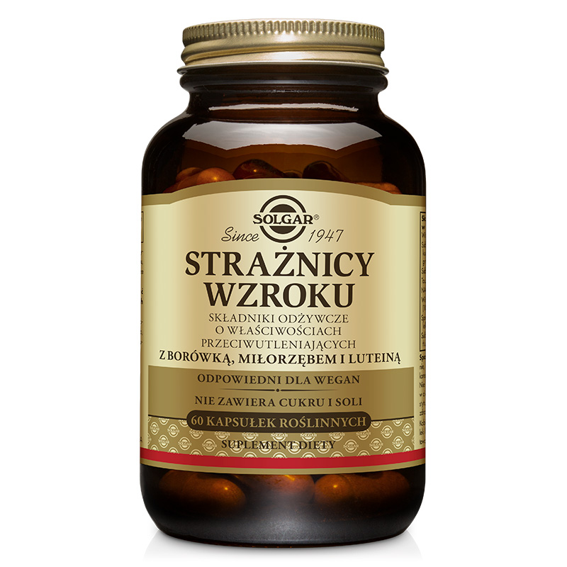 Strażnicy wzroku to formuła, w której skład wchodzi witamina A, C, E oraz cynk i selen. Składniki te stanowią wspaniałe źródło antyoksydantów neutralizujących szkodliwe działanie wolnych rodników. W kompozycji znajduje się także luteina i zeaksantyna oraz NAC, czyli n-acetylo-l-cysteina. Dodatkowo suplement ten zawiera takie składniki jak borówka i miłorząb japoński oraz świetlik.