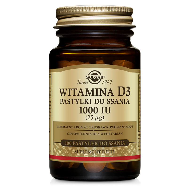 Solgar Witamina D3 1000 IU (25 µg) zawiera witaminę D w formie cholekalcyferolu. Pastylki mają przyjemny bananowo-truskawkowy smak, co może ułatwiać ich stosowanie, szczególnie u dzieci.