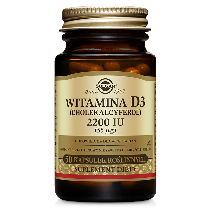 Każda kapsułka Solgar Witamina D3 2200 IU dostarcza 55 µg witaminy D3 w formie cholekalcyferolu, która jest dobrze przyswajalna przez organizm. Produkt jest szczególnie polecany w okresach zwiększonego zapotrzebowania na witaminę D.