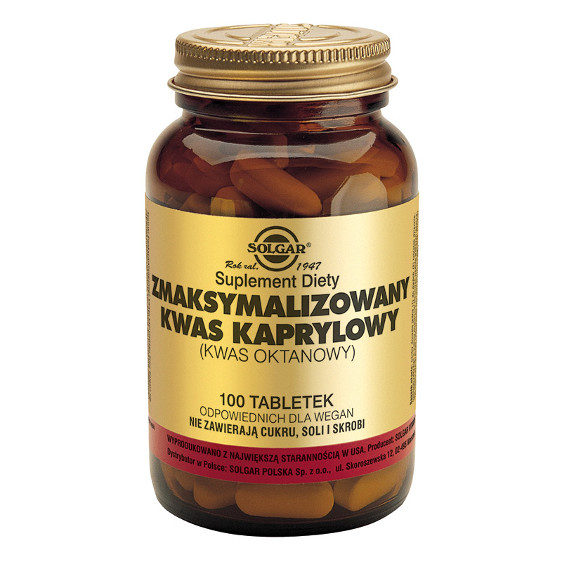 Zmaksymalizowany Kwas Kaprylowy z puntu widzenia chemicznego jest nasyconym kwasem tłuszczowym, kwasem oktanowym. Pozyskiwany jest z roślinnego oleju palmowego, jest zmaksymalizowany co zapewnia odpowiednio wysoką dawkę. W suplemencie diety marki Solgar został połączony z takimi minerałami jak magnez, wapń, cynk i potas, dzięki czemu jego wchłanianie zostało spowolnione, dzięki czemu ma możliwość silniejszego i dłuższego działania. Preparat wskazany jest w przypadku nadmiernego apetytu na słodycze.