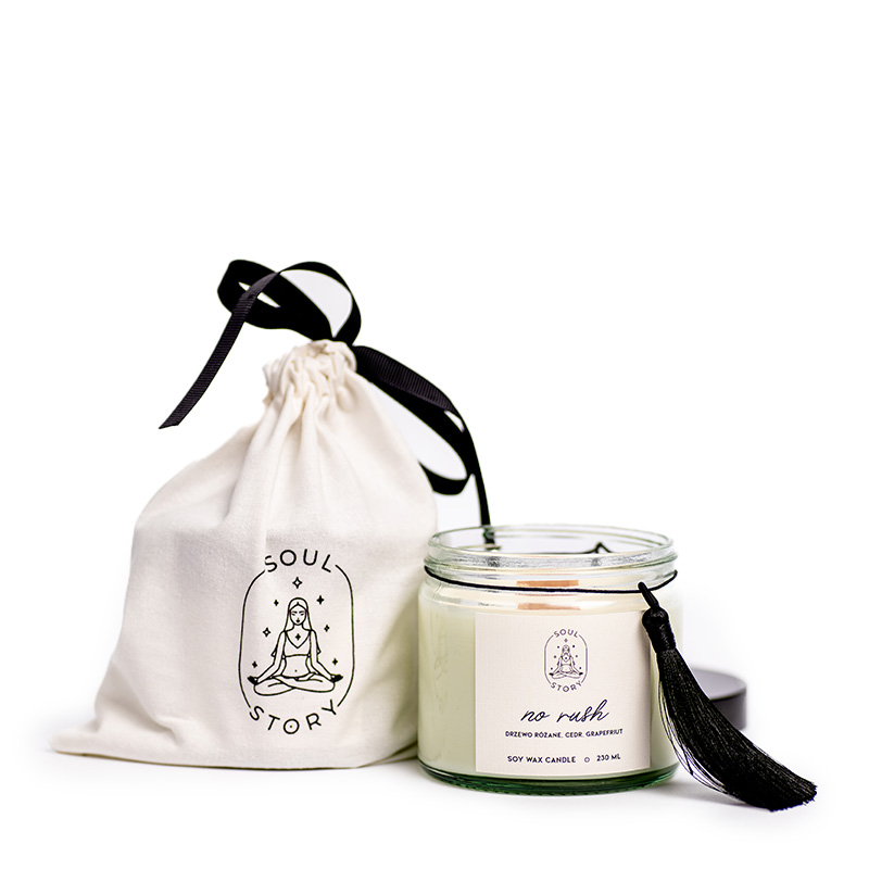 Świeca sojowa z drewnianym knotem Soul Story zapakowana jest w estetyczny, bawełniany woreczek, dzięki czemu łatwo się ją przechowuje, a także może stanowić wyjątkowy prezent dla bliskich osób.