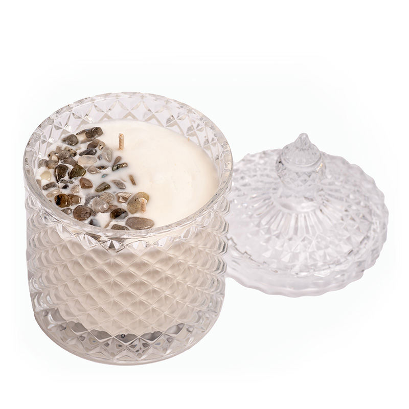 Ręcznie wykonana świeca sojowa wzbogacona dodatkiem naturalnych olejków eterycznych oraz kamieni labradorytu. Ze względu na wysoką zawartość olejków eterycznych świeca otula pomieszczenie wyjątkowym i aromatycznym zapachem.
