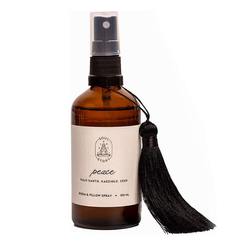 Zapach cedru, kadzidła i palo santo, który charakteryzuje produkt Peace Room And Pillow Spray, daje poczucie głębokiego relaksu i spokoju.