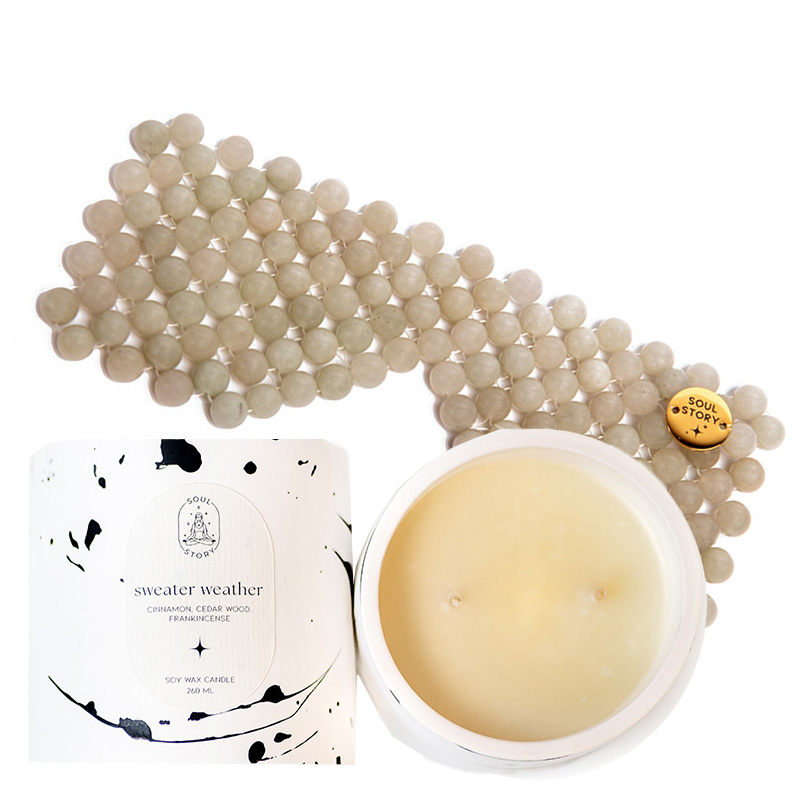Świeca sojowa Soul Story zapakowana jest w bawełniany woreczek.