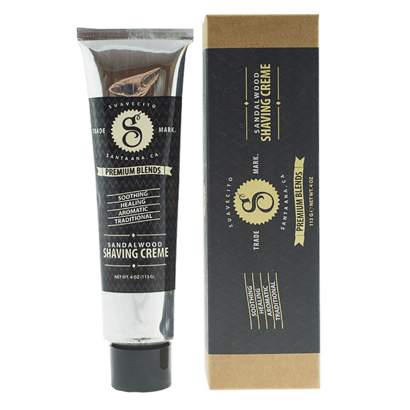 Premium Shaving Creme Sandalwood - Krem do golenia, wyciąg z drzewa sandałowego. Obecność w składzie preparatu wyciągu z drzewa sandałowego zapewnia niezwykle silne orzeźwienie skóry oraz przepiękny, świeży zapach. W formule znajdziemy również składniki zmiękczające zarost oraz poprawiające poślizg maszynki np. olejek z pestek winogron oraz aloes. Produkt jest niezwykle wygodny w użyciu, mocno się pieni, nie spływa z twarzy oraz jest bardzo wydajny. Golenie przy użyciu kremu Suavecito to czysta przyjemność! Dodatkowo produkt został zapakowany w klasyczną,metalową tubkę, która będzie pasować do każdej męskiej łazienki.
