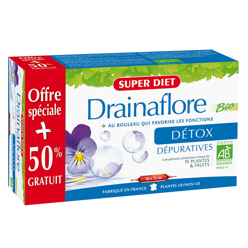 Drainaflore Detox - Detoksykacja. To wysokiej jakości bio-suplement, w którego skład wchodzi kompozycja aż 15 ekstraktów z owoców i roślin w 100% oraganicznych i naturalnego pochodzenia. Ukierunkowane są one na działanie detoksykujące, oczyszczające i regenerujące. W skład Drainaflore Detox wchodzi ekstrakt z rozmarynu, czarnego bzu, dziewanny, czarnej rzodkiewki, łopianu, cykorii i śliwki, które działają ze sobą w pełnej synergii. Produkt przyczynia się do regulowania prawidłowego rytmu pracy jelit i naturalnego mechanizmu wydalania. Suplement ten zwiększa skuteczność innych suplementów i kuracji ponieważ wspomaga ich działanie i przyswajalność poprzez oczyszczenie. Wspomaga organizm w momentach wzmożonego wysiłku i zmian pór roku.