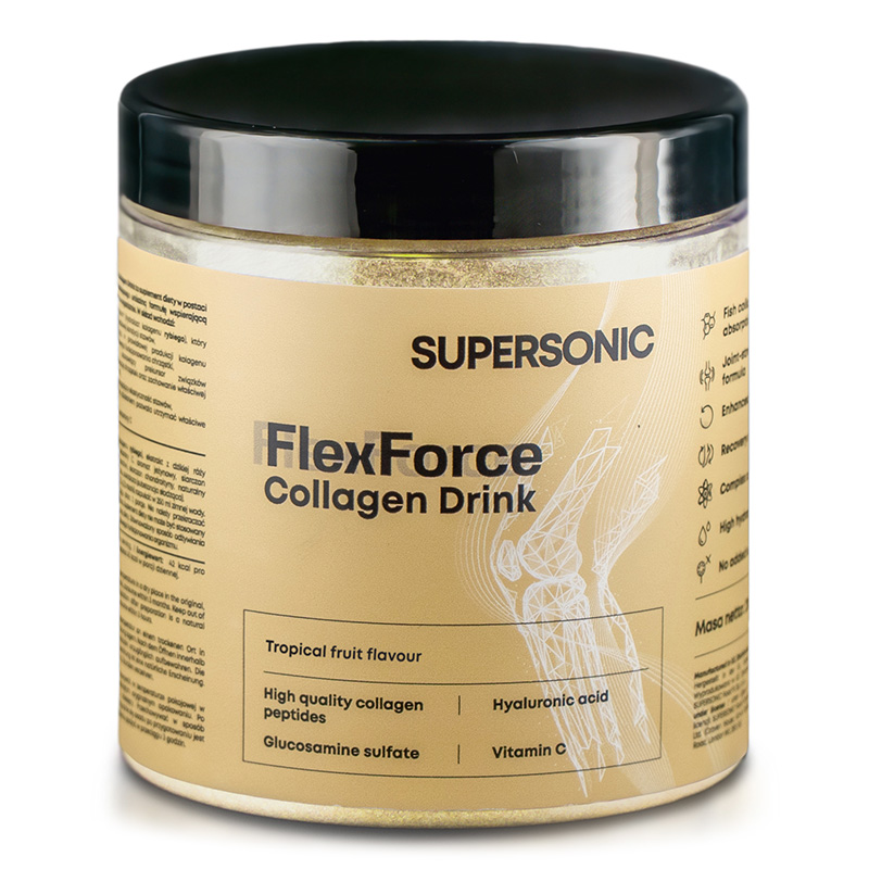 Swoje działanie Flex Force Collagen Drink zawdzięcza zawartości hydrolizatu kolagenu rybiego, który jest źródłem kolagenu typu I. Recepturę wzbogacono składnikami takimi jak siarczan chondroityny, kwas hialuronowy oraz ekstrakt z dzikiej róży. Surowce te wspomagają kondycję stawów, chrząstek, kości, a także mięśni.