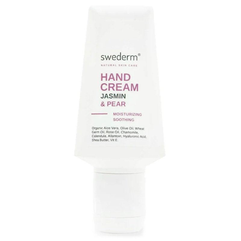 Hand Cream Jasmin Pear - Jaśminowy krem do dłoni. Lekki krem do dłoni o działaniu nawilżającym, odżywczym i ochronnym. Bogactwo naturalnych składników ma także działanie przeciwstarzeniowe i łagodzące. Miąższ z liści aloesu łagodzi podrażnienia, kwas hialuronowy oraz gliceryna tworzą na skórze warstwę ochronną, która zapobiega utracie wody z naskórka. Ekstrakt z owoców Oliwki Europejskiej działa antyoksydacyjnie, masło shea pomaga odbudować barierę lipidową skóry, jest ono także bogate w witaminę E oraz pełni funkcję emolientu. Olej z kiełków pszenicy, ekstrakt z kwiatów rumianku oraz ekstrakt z kwiatów nagietka łagodzą podrażnienia, działają antyoksydacyjnie, a także regenerują skórę. Alantoina łagodzi podrażnienia i zaczerwienienia skóry. Krem nawilża i wygładza skórę dłoni, nie nie pozostawiając uczucia lepkości.