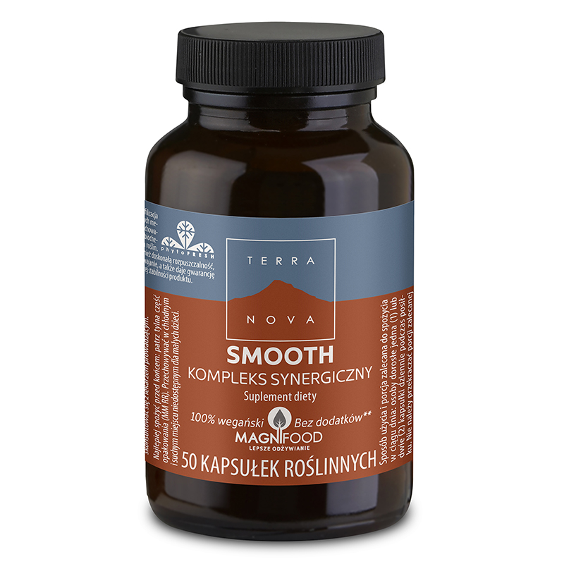 Smooth - Kompleks synergiczny. Bogactwo adaptogenów jak Ashwagandha, Żeń-szeń i Rhodiola zawartych w kompleksie MagniFood. Jest to połączenie składników pochodzenia roślinnego i fitonutrientów do stworzenia którego wykorzystuje się naturalne składniki. Poprawiają one działanie, biodostępność i stabilność innych składników, zwiększają ich aktywność oraz chronią przed utlenianiem. W kompozycji znajdują się również magnez i witaminy z grupy B. W składzie suplementu nie ma substancji dodatkowych, ani składników pochodzenia zwierzęcego, dzięki czemu jest odpowiedni dla wegan i wegetarian.
