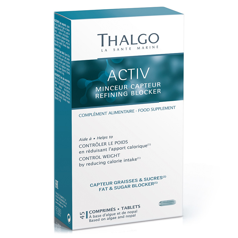 Formuła Thalgo Activ Refining Blocker zawiera ekstrakt z opuncji figowej oraz ekstrakt z alg Chlorella. Produkt stanowi uzupełnienie codziennego jadłospisu i może być stosowany w ramach zbilansowanej diety.