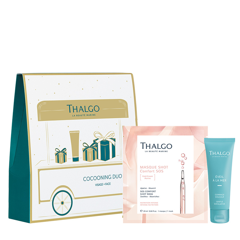 Zestaw peelingu i maski Cocooning Duo marki Thalgo to idealne rozwiązanie dla każdego rodzaju skóry, szczególnie suchej i potrzebującej natychmiastowego nawilżenia. Peeling, choć bardzo delikatny, skutecznie wygładza i przygotowuje skórę na aplikację maski. Jego formuła łączy działanie chemiczne i mechaniczne, dzięki czemu jest odpowiedni nawet dla cer wrażliwych. Maska w płachcie działa jak intensywna kuracja nawilżająco-kojąca – bogata esencja otula skórę, niwelując uczucie ściągnięcia i pozostawiając ją miękką oraz komfortową. Dzięki gęstej formule przypominającej krem, po jej zdjęciu nie ma potrzeby aplikacji dodatkowego kosmetyku. To świetnie skomponowany duet, który w krótkim czasie przywraca skórze blask i nawilżenie. Dodatkowo eleganckie opakowanie sprawia, że doskonale nadaje się na prezent.