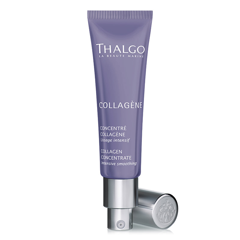 Collagen Concentrate - Serum kolagenowe, które natychmiastowo po aplikacji zmniejsza drobne zmarszczki i linie będące pierwszymi oznakami starzenia się skóry. Cera staje się wygładzona, a dzięki innowacyjnej formule preparatu jaką jest "druga skóra" również aksamitnie miękka oraz matowa. Kolagen pełni funkcję rusztowania, dzięki temu zapewnia skórze elastyczność i jędrność oraz rewelacyjne nawilżenie, dzięki czemu problem zmarszczek zostaje zniwelowany. Sok z aloesu zwyczajnego wykazuje działanie silnie nawilżające, łagodzące podrażnienia oraz przeciwzapalne i ochronne. Witamina C pozyskiwana z algi Palmaria Palmata wykazuje silne działanie antyoksydacyjne opóźniając proces starzenia, świetnie wyrównuje koloryt cery i rozświetla ją. Z kolei glipopetydy z soi działają stymulująco na aktywność fibroblastów zwiększając ich namnażanie. W widoczny i natychmiastowy sposób kondycja skóry zostaje poprawiona, a twarz zyskuje piękny blask i jedwabistą gładkość.