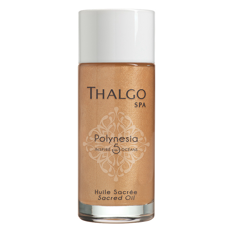 Polynesia Sacred Oil - Tradycyjny olejek z Polinezji, którego składniki pochodzą z egzotycznej Polinezji, a inspirację stanowi sekret urody kobiet plemienia Ma'hoi. Suchy olejek posiada niezwykle lekką konstyncję nie pozostawiając na skórze i włosach tłustej, lepkiej warstwy. Rewelacyjnie odżywia skórę dzięki obecności kompleksu Algo-Monoi Sargassum, czyli ekstrakt z gronorostu, kopra i olejej Manoi. Jest składnikiem zarówno relaksującym ciało, jak i nawilżającym oraz zmiękczającym skórę. Oleje roślinne słonecznikowy, sezamowy oraz z pestek moreli zapewniają głębokie odżywienie, natłuszczenie skóry oraz wspaniałą regenerację wraz z działaniem przeciwstarzeniowym. Dodatkowym atutem są złote drobinki pięknie i natychmiastowo rozświetlające skórę i włosy. Niesamowity, egzotyczny zapach olejku zabiera daleko stąd, na spokojne polinezyjskie wyspy pozostawiając ukojone zmysły i aksamitnie gładką skórę.