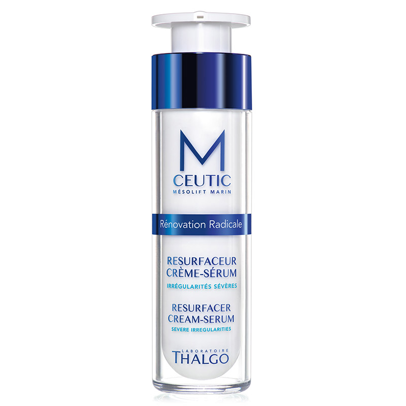 Resurfacer Cream-Serum - Intensywnie korygujący krem-serum. Innowacyjny kosmeceutyk wspomagający skórę w walce z niedoskonałościami, nadaje jej idealny wygląd. Bogactwo składników oraz innowacyjne technologie zapewniają wspaniałe rezultaty. Mésolift Marin®, czyli 32 poli-odżywcze substancje, adenozyna i kwas hialuronowy rewelacyjnie nawilżają i regenerują skórę. Kompleks Neo-Skin® stanowiący połączenie ekstraktu z liści Buchu, brązowej makroalgi Fucus spiralis oraz zielonej mikroalgi Tetraselmis Chui reguluje i zmniejsza wydzielanie sebum. Sytenol A, wyciąg z nasion Babchi, rośliny indyjskiej, wykazuje działanie zbliżone do retinolu, pobudza komórki do odnowy. Z kolei Synactin AC zmniejsza syntezę melaniny jednocześnie rozjaśniając przebarwienia.Witamina B3 wspomaga walkę z przebarwieniami oraz rewelacyjnie pielęgnuje skórę trądzikową i tłustą. Rezultatem stosowania kosmeceutyku jest aksamitnie gładka, doskonale oczyszczona i idealna cera.