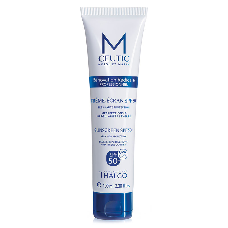 Sunscreen SPF 50+ - Ochronny krem z filtrem dedykowany dla każdego typu cery o bardzo lekkiej konsystencji. Odpowiednia kompozycja składników zapewnia doskonałą pielęgnację bez działania komedogennego. Kompleks Sun'Ytol® będący wyciągiem z czerwonych alg oraz inne filtry przeciwsłoneczne zapewnia pełną ochronę przeciwsłoneczną zarówno dla promieniowania UVA jak i UVB. Bardzo wysoka ochrona SPF 50 zapewnia odpowiednie zabezpieczenie przed poparzeniem słonecznym bez białego filmu na twarzy. Jest więc idealny już od pierwszych dni opalania oraz po zabiegach złuszczających i profesjonalnym zabiegu Thalgo Rénovation Radicale. W recepturze znajduje się składnik Astaxanthine jest najsilniejszym antyoksydantem neutralizującym szkodliwe działanie wolnych rodników, w związku z czym wykazuje świetne działanie anty-aging. Rezultatem jest gładka, świetnie chroniona skóra.