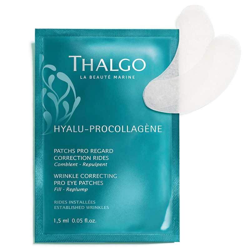 Składowa Thalgo Wrinkle Correcting Eye Pro Patches 8 sachets Wygładzająco-przeciwzmarszczkowe płatki okolice oczu występuje w zestawie Plumping Beauty Kit w zmienionej objętości.