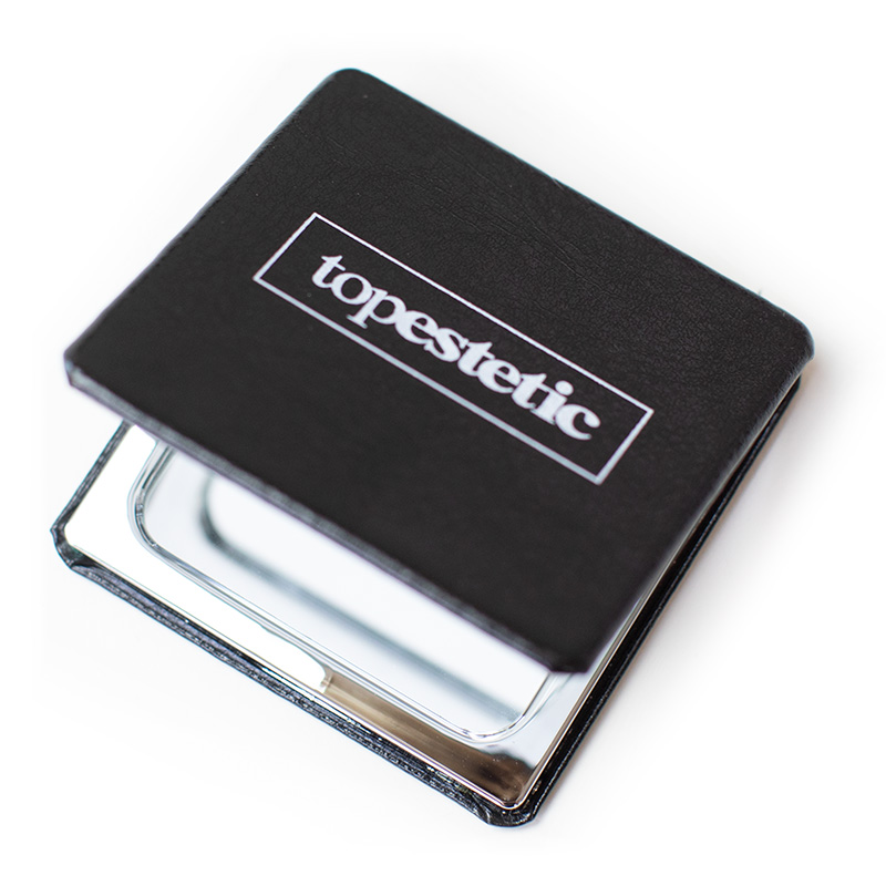 Niewielkie, dwustronne lusterko, które idealnie sprawdzi się na co dzień w torebce lub w podróży. Ułatwia poprawę makijażu w ciągu dnia. Lusterka umieszczone zostały w metalowej ramce. Produkt posiada trwałe zamknięcie oraz eleganckie wykończenie z ekologicznej skóry w kolorze czarnym, zabezpieczające przed zarysowaniem lub uszkodzeniem. Na zewnętrznej stronie produktu widnieje logo Topestetic.