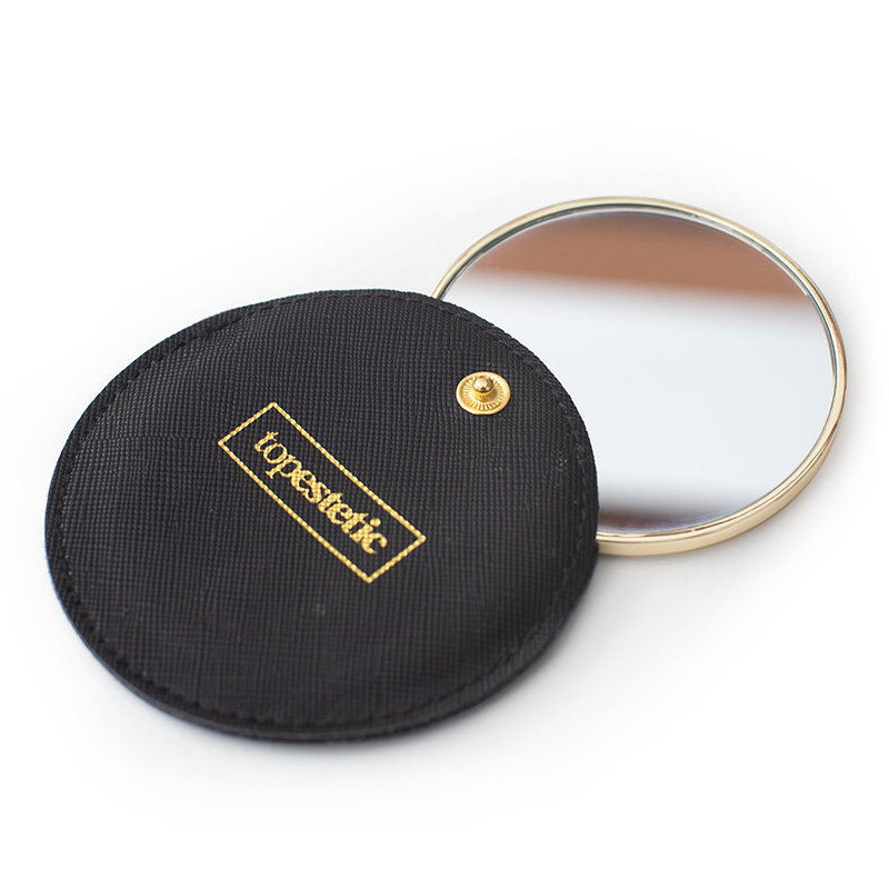 Eleganckie lusterko o średnicy 7 cm. Tył lusterka wykonany został z metalu o złotym kolorze z napisem Topestetic. Produkt występuje w zestawie z gustownym etui wykonanym z ekologicznej skóry, zamykanym na zatrzask i ozdobionym logiem Topestetic. Etui chroni lusterko przed zarysowaniem lub uszkodzeniem, ułatwiając przechowywanie. Produkt idealnie sprawdzi się na co dzień lub w podróży ułatwiając poprawę makijażu w ciągu dnia.