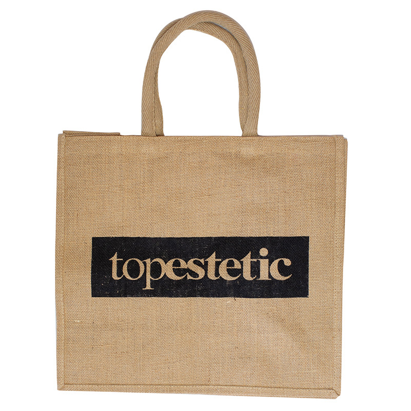 Duża, poręczna, ekologiczna torba jutowa z logo Topestetic nadrukowanym na każdej ze stron. Idealna na zakupy lub w podróży. Wykonana z grubej wytrzymalej juty, posiada dwa solidnie splecione uchwyty. Torba jest bardzo poręczna i bardzo wytrzymała.