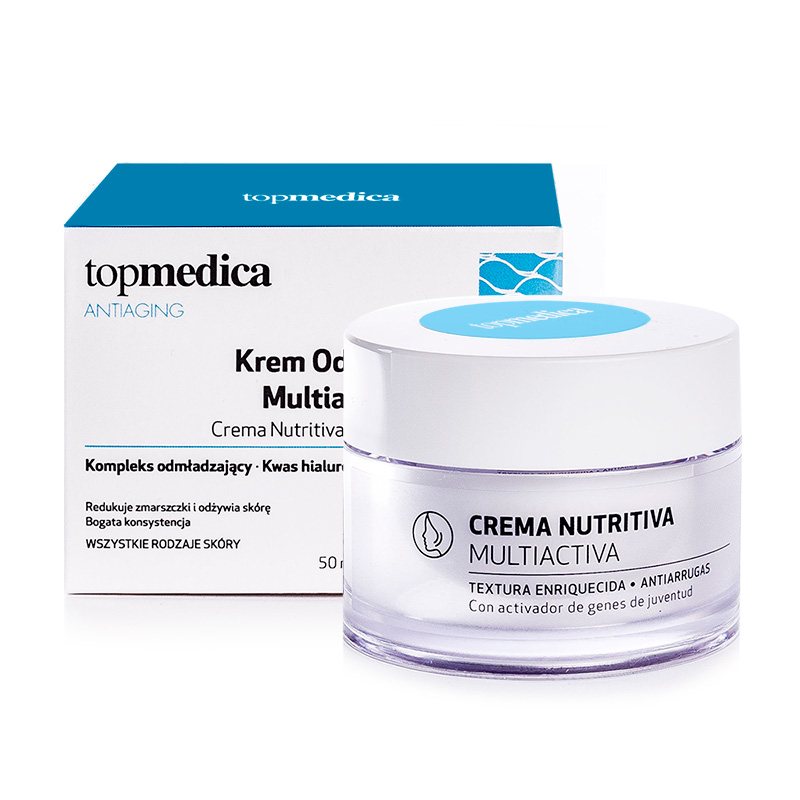 Crema Nutritiva Multiactiva - Krem odżywczy multiaktywny. Pielęgnacja przeciwstarzeniowa poprawiająca gęstość skóry. Przeznaczona dla skór suchych, wrażliwych z widocznymi oznakami starzenia. Formuła bogata w odmładzający kompleks, aktywujący syntezę kolagenu, elastyny i kwasu hialuronowego. Doskonale wiąże wilgoć w głębokich warstwach skóry oraz wypełnia zmarszczki od wewnątrz przywracając “trójkąt piękności” skóry . Zalecany jako odżywczy krem na noc, jego bogata i odżywcza konsystencja zapewnia komfort i dobre samopoczucie skórze na długi czas.