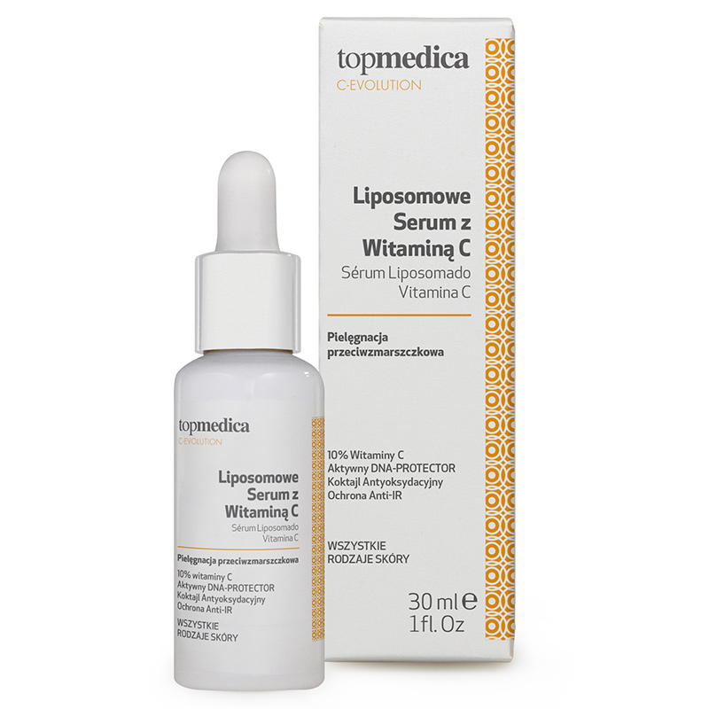 Serum Liposomado Vitamina C - Liposomowe serum z witaminą C. Serum o konsystencji półpłynnego żelu przeznaczone do pielęgnacji skóry suchej, szorstkiej, pozbawionej blasku, o nierównym kolorycie skóry. Dzięki zastosowaniu silnej dawki antyoksydantów działa silnie przeciwstarzeniowo, rozjaśnia skórę oraz ujednolica jej koloryt. Ponadto stymuluje syntezę kolagenu i elastyny dzięki czemu zwiększa napięcie i jędrność skóry. Serum zawiera także składniki działające ochronnie na DNA komórkowe, chroniąc je przed uszkodzeniami związanymi z promieniowaniem UVB i IR, i uzupełniając pielęgnację fotoprotekcyjną.