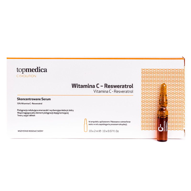 Vitamina C Resveratrol - Witamina C Resweratrol. Intensywna pielęgnacja rozświetlająca przeznaczona dla każdego typu skóry, szczególnie dojrzałej, szarej, pozbawionej blasku, z pierwszymi oznakami starzenia. Dzięki zawartości 15% witaminy C i resweratrolu wykazuje silne działanie antyoksydacyjne. Koncentrat wzbogacony w wyciąg z aceroli i niacynamid silnie regeneruje skórę, rozjaśnia ją oraz wygładza drobne linie mimiczne. Eliminuje szkody związane z ekspozycją na działanie czynników zewnętrznych takich jak smog, dym tytoniowy czy promieniowanie UV. Zalecany wspomagająco przy kuracjach depigmentujących.