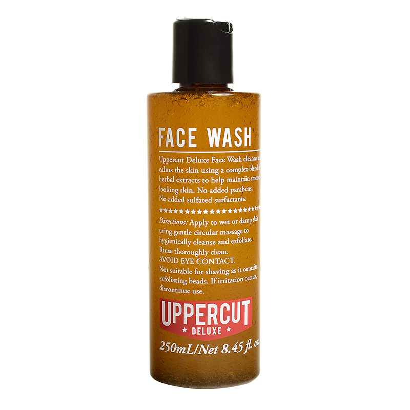 Face Wash - Płyn do mycia twarzy z peelingiem. Żel został stworzony aby dokładnie oczyszczać skórę twarzy oraz dodawać energii, bez zapachu słodkości, kwiatów lub innego kojarzącego się z damskimi kosmetykami. Znalezienie idealnego żelu do mycia twarzy dla prawdziwego mężczyzny jest nie lada wyzwaniem. Zespół Uppercut Delux chciał aby produkt spełniał wymagania myjące, bez pozostawiania zapachu perfum, jak to bywa często w przypadku tego typu produktów. Stało się wyzwaniem, aby stworzyć produkt pachnący męskością. Produkt ten jest idealnym uzupełnieniem codziennej, męskiej pielęgnacji. W składzie znajdziemy najlepsze składniki aktywne, m.in. Ekstrakty ziołowe, bez dodatku parabenów oraz SLS. Idealnie sprawdzi się w przypadku skóry wrażliwej, tłustej czy wysuszonej. Dodatkowo żel zawiera złuszczające drobinki, które usuną martwy naskórek, pozostawiając skórę gładką i dokładnie oczyszczoną.