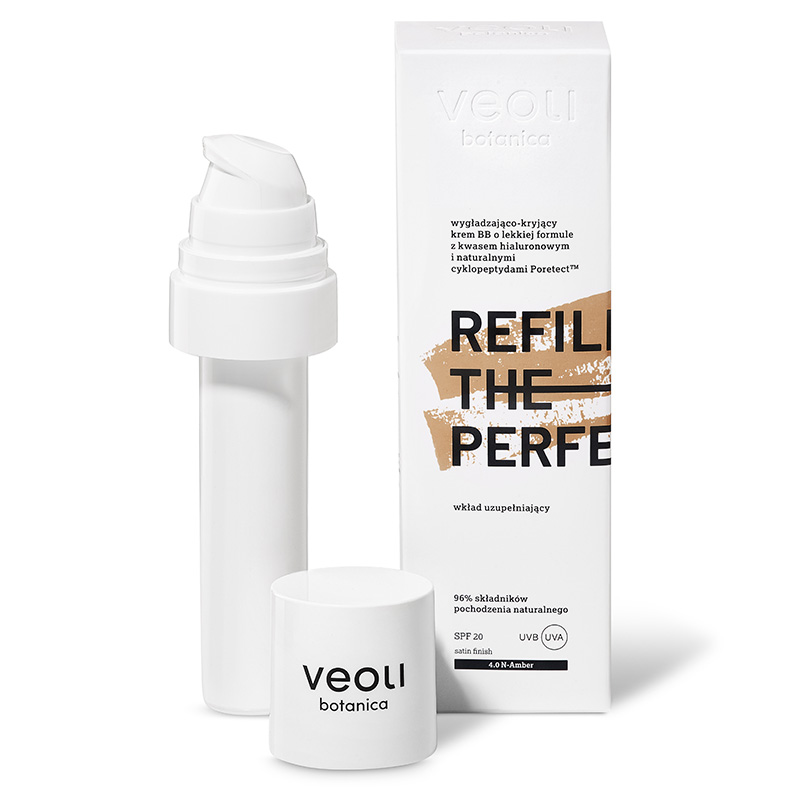 Delikatny krem BB w opakowaniu typu refill o satynowym wykończeniu. Krem zapewnia długotrwały, promienny wygląd. Kosmetyk intensywnie wygładza strukturę naskórka jednocześnie dzięki mineralnej ochronie SPF 20 i protekcji zarówno przed promieniowaniem UVA jak i UVB wspomaga ochronę przed fotostarzeniem. Dzięki zawartości cyklopeptydów Poretect TM kosmetyk oprócz wizualnej poprawy wyglądu skóry wspomaga poprawę elastyczności i wpływa na optyczne zwężenie porów. Kosmetyk nie posiada zapachu i jest odpowiedni nawet dla bardzo wrażliwych skór. Niebieska stokrotka umieszczona w składzie wykazuje intensywne działanie przeciwzapalne i łagodzi zaczerwienienia, zawarty kwas hialuronowy nawadnia głębokie warstwy naskórka a ekstrakt z kwiatu porcelanowego gwarantuje wygładzenie i rozświetlenie. Stopień krycia kosmetyku można budować od delikatnego do pełnego. W zależności od tego czy po zakończeniu makijażu zastosujemy puder matujący czy rozświetlający możemy zmienić wygląd i efekt końcowy kremu. Produkt zapewnia świeże, zdrowe wykończenie i właściwości pielęgnacyjne.