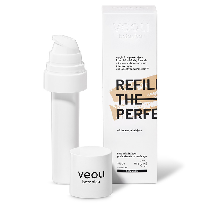 Drop of Perfection Vanilla - Refill Wygładzająco-kryjący krem BB o lekkiej formule z kwasem hialuronowym - uzupełnienie. Refill powstał aby ograniczyć ilośc odpadów produkowanych przez zużyte opakowania, jego waga jest niższa przez co zmniejsza się ślad węglowy podczas transportu.