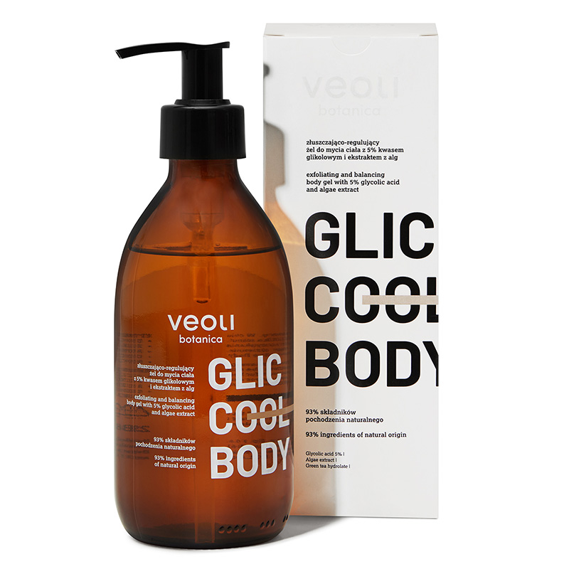 Głównym składnikiem żelu Glic Cool Body jest 5% kwas glikolowy, posiadający właściwości złuszczające i pielęgnacyjne. Ekstrakt z alg korzystnie wpływa na skórę dając jej pełne ukojenie i nawilżenie. Hydrolat z zielonej herbaty działa antyoksydacyjne i rewitalizujące. Dodatkowo żel zawiera pantenol, glicerynę i witaminę E.