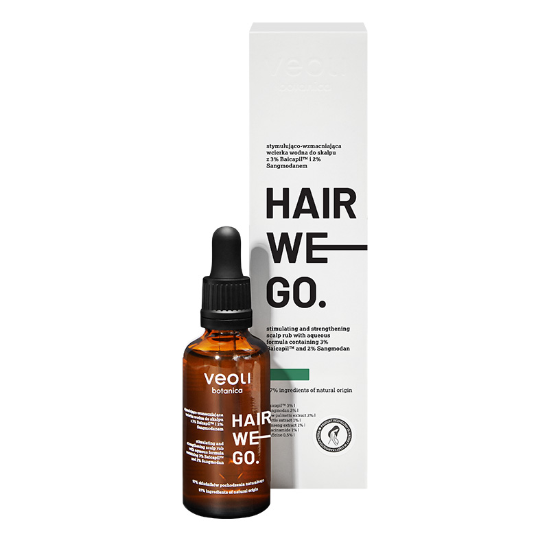 Veoli Botanica Hair We Go to stymulująco‑wzmacniająca wcierka do skóry głowy, opracowana w oparciu o starannie dobrane składniki aktywne. Produkt zawiera m.in. 3 % kompleksu Baicapil™ oraz 2 % Sangmodan™, które wspierają gęstość włosów i wydłużają fazę wzrostu (anagen) poprzez aktywację mieszków włosowych. Formuła została dodatkowo wzbogacona o ekstrakt z palmy sabałowej (2 %), pokrzywę, żeń‑szeń, niacynamid oraz kofeinę, co zapewnia wielotorowe wsparcie zarówno włosom, jak i skórze głowy.