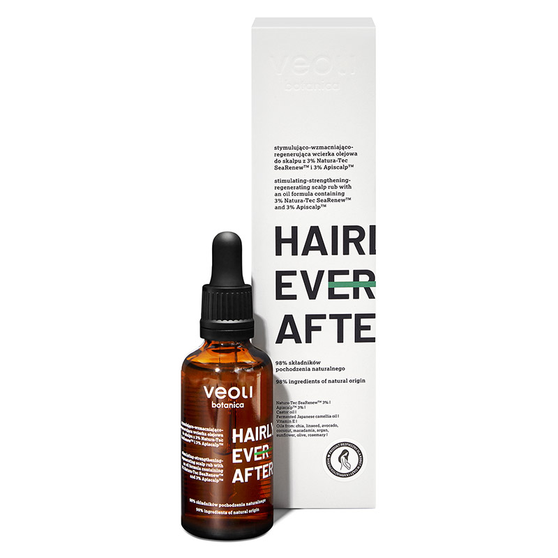 Kosmetyk Hairly Ever After marki Veoli Botanica szczególne zagości w pielęgnacji osób poszukujących naturalnych produktów. To skoncentrowana formuła, która aplikowana na skalp nawilża skórę głowy, łagodzi wszelkie podrażnienia, związany z nimi świąd, a jednocześnie pobudza wzrost włosów i ogranicza ich nadmierne wypadanie. Kosmetyk charakteryzuje się olejową formułą, dzięki czemu łatwo się rozprowadza, a aplikację wzbogaca intensywny, ziołowy zapach z wybijającą się, energetyzującą, rozmarynową nutą. Produkt stanowi uzupełnienie odpowiednio skomponowanej pielęgnacji skóry głowy. Z uwagi na konsystencję kosmetyku sugeruję stosowanie go przed etapem mycia włosów lub pozostawienie go na całą noc, dodatkowo zabezpieczając czepkiem. Stymulująco – wzmacniająco – regenerująca wcierka olejowa do skalpu połączona z regularnym masażem skóry głowy może przynieść jeszcze większe, bardziej satysfakcjonujące rezultaty.