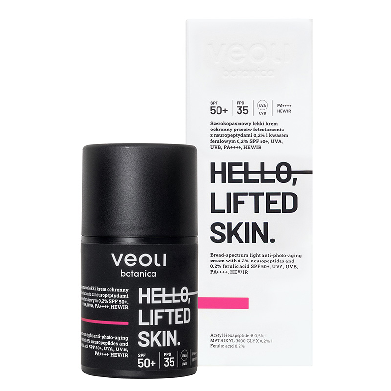 Lekka, komfortowa formuła kremu szybko się wchłania i idealnie współgra z makijażem. Hello, Lifted Skin SPF 50+,PA++++ posiada orientalny, kwiatowy, słodki zapach. Produkt ten sprawdzi się również podczas kuracji retinoidami i kwasami, jako tarcza ochronna i pielęgnacja liftingująca w jednym.