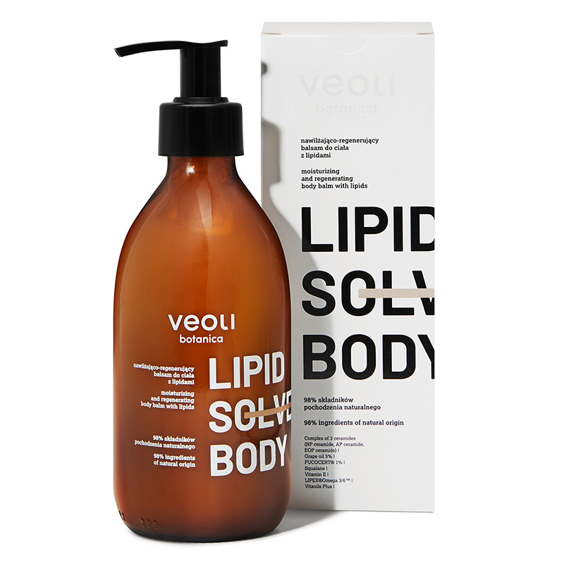 W składzie balsamu Lipid Solve Body znajdują się naturalne lipidy, kwasy omega 3 i 6, skwalan oraz kompleks ceramidów składający się z Ceramide AP, Ceramide NP oraz Ceramide EOP. Kompleks ten wykazuje działanie odbudowujące oraz chroni przed utratą wody z naskórka.