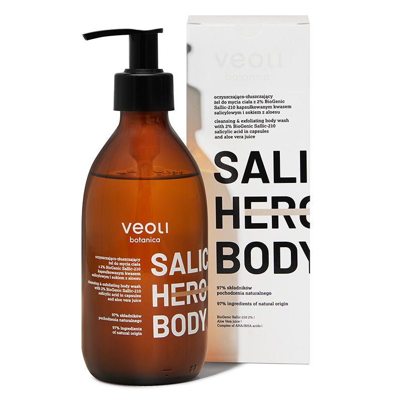 Głównym składnikiem żelu Salic Body Hero jest 2% kwas salicylowy zamknięty w mikrokapsułkach. Jego kontrolowane uwalnianie skutecznie złuszcza i jednocześnie nie podrażnia. Sok z aloesu wykazuje działanie antyoksydacyjne, nawilżające i regenerujące. Ekstrakt z brzozy odświeża i tonizuje skórę.