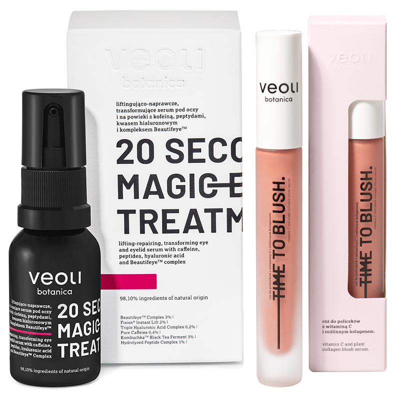 20 Seconds Magic Eye Treatment Serum pod oczy i na powiekiKompleks wyciągów roślinnych, ekstrakt z czarnej herbaty Kombuchka, kofeina, hydrolizat protein owsa, olej z awokado, potrójny wielocząsteczkowy kwas hialuronowy, hydrolizat protein soi, ekstrakt z mikroalg Rhodella z Morza Północnego, woda lawendowa, witamina E, ekstrakt z ogórka.
