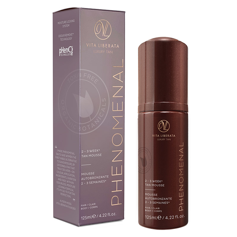 pHenomenal 2-3 Week Tan Mousse Fair - Samoopalająca pianka - odcień jasny. Dzięki technologii pHenO2 pianka zapewnia piękny efekt naturalnej opalenizny, który pojawia już trakcie jednorazowej aplikacji preparatu, a rezultaty stosowania są widoczne nawet do 2-3 tygodni. Efekt zostaje utrwalony w ciągu 4-8 godzin od zastosowania pianki. Kosmetyk zawiera w swym składzie wyciąg z aloesu zwyczajnego, który działa na skórę kojąco i nawilżająco, witaminę E oraz ekstrakt z ogórka zapobiegające przesuszaniu, ponadto wzmacniają barierę naskórkową i napinają skórę. Po aplikacji pianki zastosowany Moisture Locking System zapewnia odpowiednie nawilżenie skóry nawet do 72 godzin, a Flash Dry gwarantuje szybkie wysychanie produktu, czyli skóra pozostaje bez uczucia lepkości. Z kolei brak nieprzyjemnego zapachu charakterystycznego dla preparatów samoopalających jest efektem użytej technologii Odor Remove.