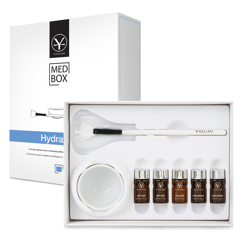 Hydrating MedBox - Zestaw 5 skoncentrowanych ampułek o intensywnym działaniu nawilżającym. 10-dniowa kuracja przeznaczona do pielęgnacji skóry suchej. Zawarte w ampułkach składniki aktywne zapewniają poprawę wyglądu i struktury skóry. Ampułka Dry Skin bogata w wyciąg z fiołka trójbarwnego wpływa na rewitalizację skóry i chroni ją przed negatywnym wpływem wolnych rodników. Główny czynnik zawarty w Ampułce Hyaluronic - kwas hialuronowy pozwala na przywrócenie odpowiedniego poziomu nawilżenia i utrzymanie prawidłowej elastyczności skóry. Z kolei Ampułka Collagen dzięki kolagenowi ujędrnia i napina skórę, nadając jej miękkość i sprężystość. Kompletna kuracja wzmacnia płaszcz hydrolipidowy oraz niweluje uczucie dyskomfortu i ściągnięcia, przywracając suchej skórze komfort.
