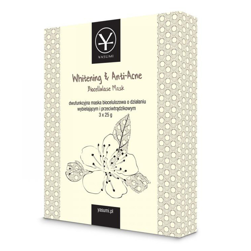 Whitening & Anti-Acne Biocellulose Mask - Dwufunkcyjna maska biocelulozowa o działaniu wybielający i przeciwtrądzikowym. Produkt przeznaczony dla skóry szarej, objętej przebarwieniami lub problemem trądziku. Innowacyjność produktu pozwala na podwójne działanie maski, od usprawnienia wchłanialności składników aktywnych po jej aktywne działanie. Niacynamid zawarty w masce ogranicza powstawanie niedoskonałości skóry - jak zaskórniki czy zmiany zapalne, łagodzi zaczerwienia i reguluje nierównomierną pigmentację. Natomiast ekstrakt z japońskiej wiśni działa silnie antyoksydacyjne, wymiata wolne rodniki z powierzchni skóry oraz wygładza jej teksturę.Dodatek rumianku działa przeciwzapalnie oraz łagodząco. Po zastosowaniu skóra staje się rozpromieniona, pozbawiona niedoskonałości i skaz.