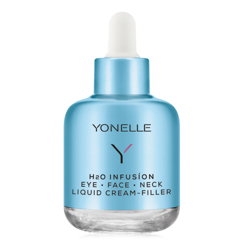 H2o Infusion Eye, Face, Neck Liquid Cream-Filler - Płynny krem-wypełniacz pod oczy, twarz i szyję dedykowany dla cery z widocznymi oznakami starzenia, wykazuje natychmiastowe działanie wygładzające skórę oraz spłycające zmarszczki. Dzięki niesamowicie bogatemu składowi, ale lekkiej, nietłustej konsystencji jest idealnym kosmetykiem dla cery dojrzałej,zarówno bezproblemowej jak i suchej, mieszanej oraz wrażliwej. Nieinwazyjne wypełniacze zmarszczek, którymi są naturalne biopolimery cukrowe oraz hialuronowe działają już w chwili aplikacji, ponieważ po wniknięciu do naskórka pęcznieją wypełniając tym samym linie i bruzdy. Idealny poziom nawilżenia gwarantują takie składniki jak NANODYSKI z PCA i kwasem hialuronowym, mocznik, seryna oraz trehaloza zatrzymując wodę i wiążąc jej cząsteczki. Efekt przeciwzmarszczkowy dzięki pobudzeniu komórkowego metabolizmu wykazują peptydy. Kamferol o działaniu podobnym do witaminy D wzmacnia odporność skóry poprawiając jej wygląd i stan. Bardzo silny antyoksydant, jakim jest biochanina opóźnia procesy starzenia się skóry, dodatkowo obkurcza rozszerzone pory i reguluje aktywność gruczołów łojowych. Krem posiada silne działanie przeciwzapalne i łagodzące jakie dają awaremidy. Efektem stosowania płynnego kremu jest widoczne spłycenie głębokich zmarszczek, lub nawet całkowite zniwelowanie drobnych, skóra jest zdecydowanie bardziej jędrna, napięta, gładsza oraz rozświetlona. Wspaniały preparat przeciwzmarszczkowy o lekkiej konsystencji i subtelnym zapachu.