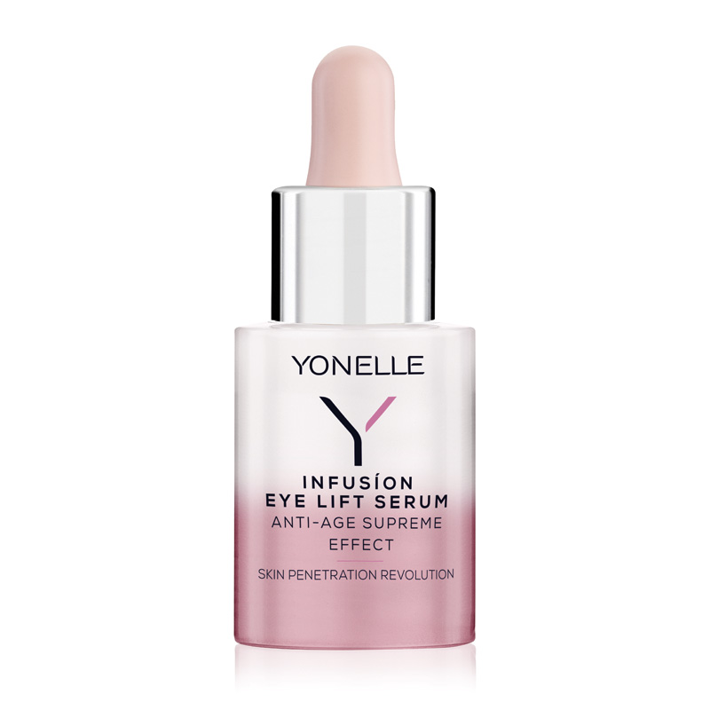 Infusion Eye Lift Serum - Liftingujące serum infuzyjne pod oczy i na powieki. Serum o działaniu liftingującym, przeznaczone do pielęgnacji okolic oczu. Redukuje oznaki starzenia się skóry. Już po 1-2 tygodniach zauważymy spłycenie zmarszczek, rozjaśnienie cieni pod oczami oraz wysoki poziom nawilżenia naskórka. Produkt często wspomaga korekcję opadającej powieki. Receptura serum zawiera NanodyskiTM, które podwyższają wchłanianie w głąb skóry kwasu hialuronowego, peptydów i retinolu do 340%. Skóra staje się odmłodzona, a spojrzenie pełne blasku.